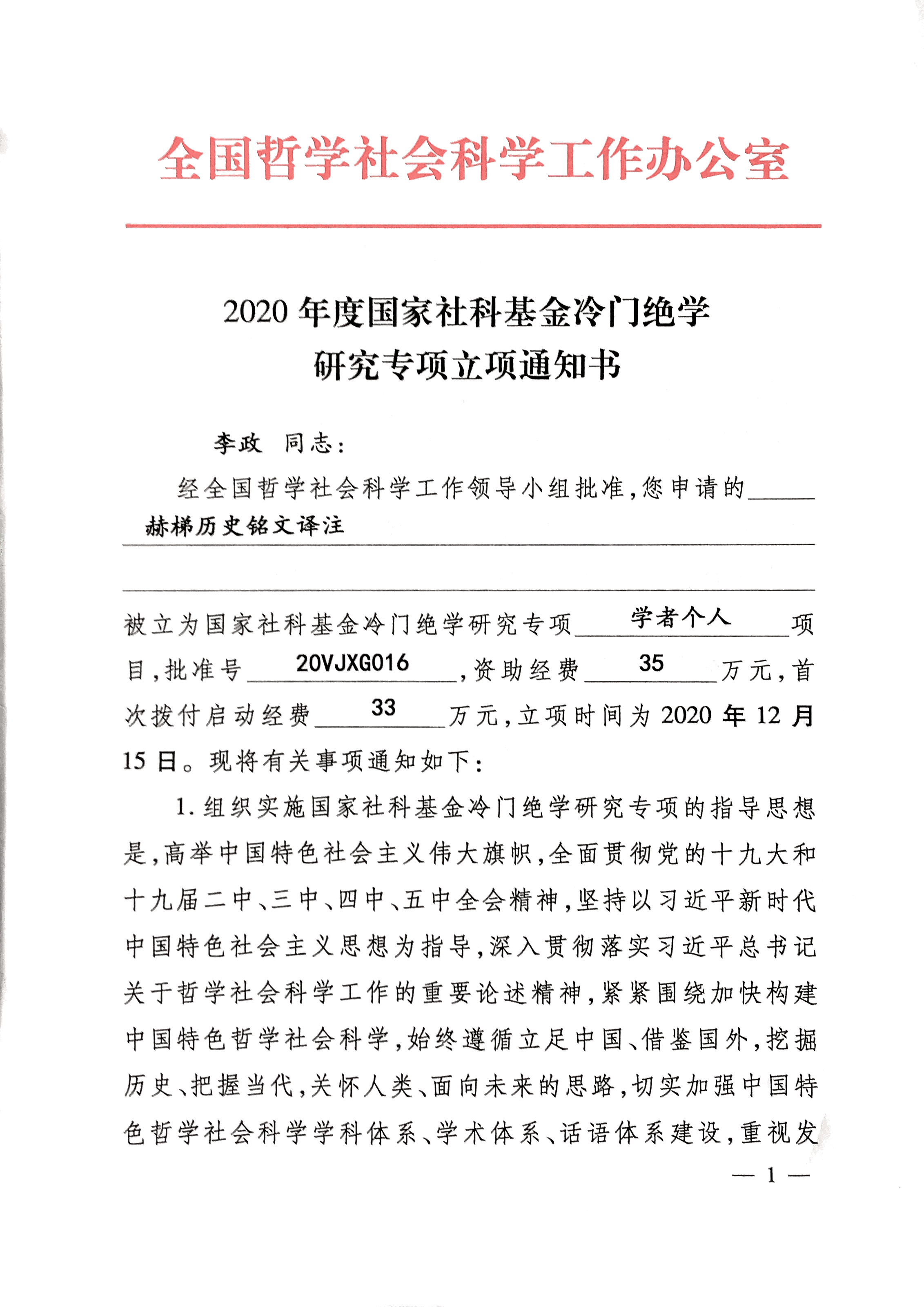 2020国家社科基金冷门绝学项目立项通知书(3):段晴、李政、叶少勇。