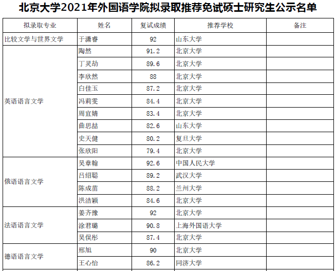 教学管理 北京大学2021年外国语学院拟录取推荐免试硕士研究生公示名单 2020-10-15 名单公示期为自发布之日起的十个工作日,如有异议,请在公示期内向学院教务办公室反映。 邮箱:gwyyjsjw@pku.edu.cn