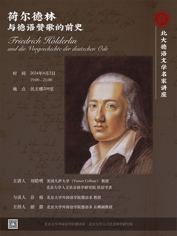 2024年4月2日晚,应MK体育在线德语系邀请,美国纽约州凡萨大学(Vassar College)教授、北京大学人文与社会科学研究院驻访学者刘皓明在MK体育在线民主楼208会议室做题为“荷尔德林与德语赞歌的前史”的讲座。讲座由德语系主任胡蔚老师担任主持,德语系谷裕教授担任与谈人,英语系高峰枫教授参与讨论。