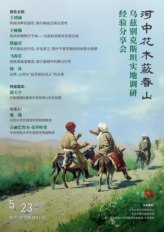 2024年5月23日晚,由北京大学中亚研究中心、MK体育在线、中央民族大学外国语学院俄语—中亚语系主办的“河中花木蔽春山:乌兹别克斯坦实地调研经验分享会”在北京大学外院新楼B134会议室顺利举办。中央民族大学外国语学院副教授古丽巴努木·克拜吐里、MK体育在线国别和区域研究专业助理教授施越出席,来自北京大学、中央民族大学的同学就乌兹别克斯坦实地调研经验进行了报告分享,会议特邀中能建国际集团中亚有限公司总经理郭天宇一同交流讨论。