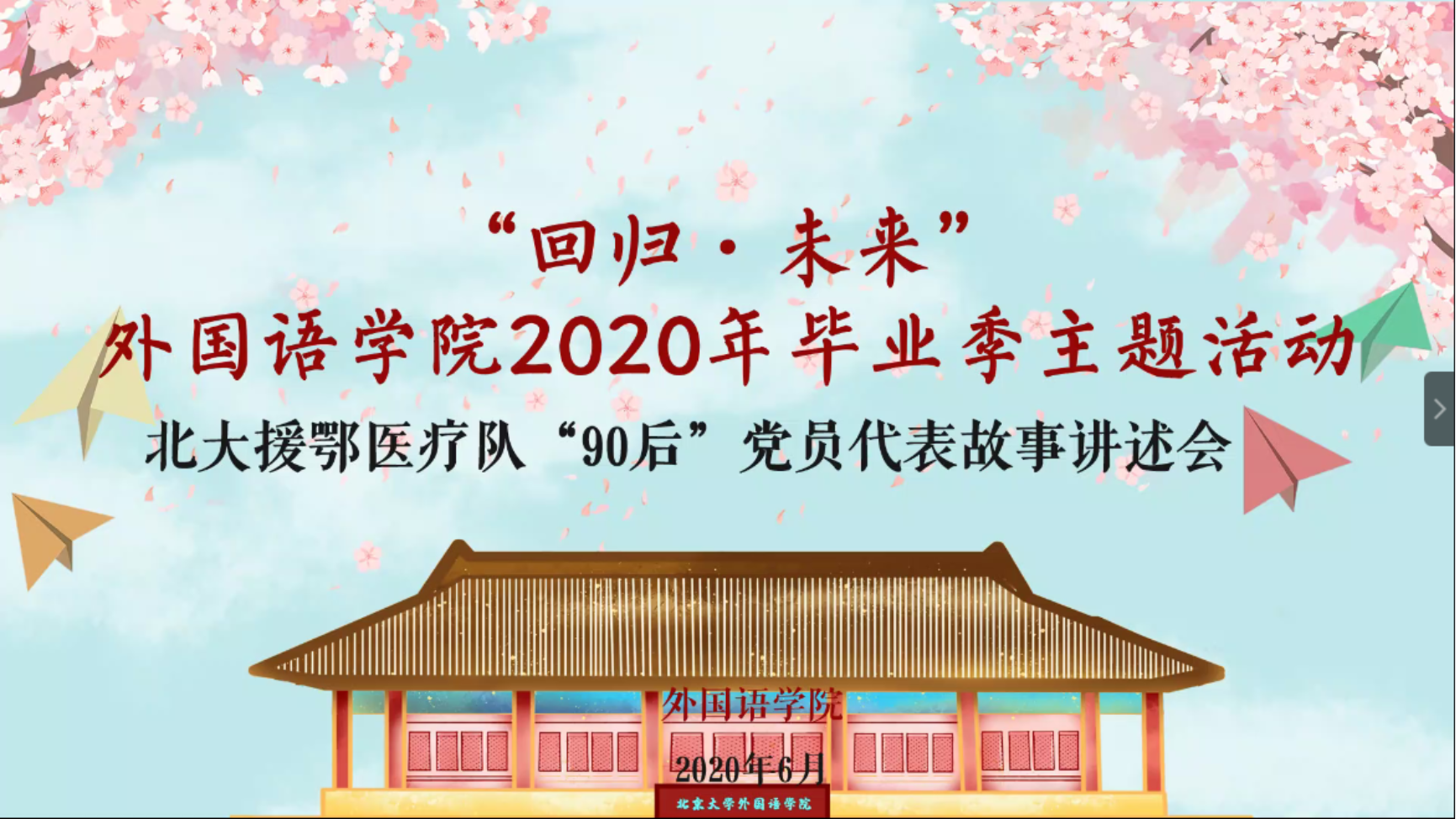 外国语学院党委书记李淑静老师向大家寄语。李老师谈到,援鄂医疗队“90后”党员的几种身份达到了和谐的统一,他们是“90后”党员,是青年,是医护人员,也是北大人。这几重身份背后的精神是抗疫胜利的重要因素,也是人民幸福、国家强大的重要因素。外院毕业生们是青年,是北大人,也有不少“90后”党员,李淑静老师向同学们寄予“聚是一团火,散作满天星”的期望,希望同学们能够结合自己的专业为国家做出贡献,在党和人民最需要的地方绽放青春的绚丽之花,为同学们送上毕业的祝福。