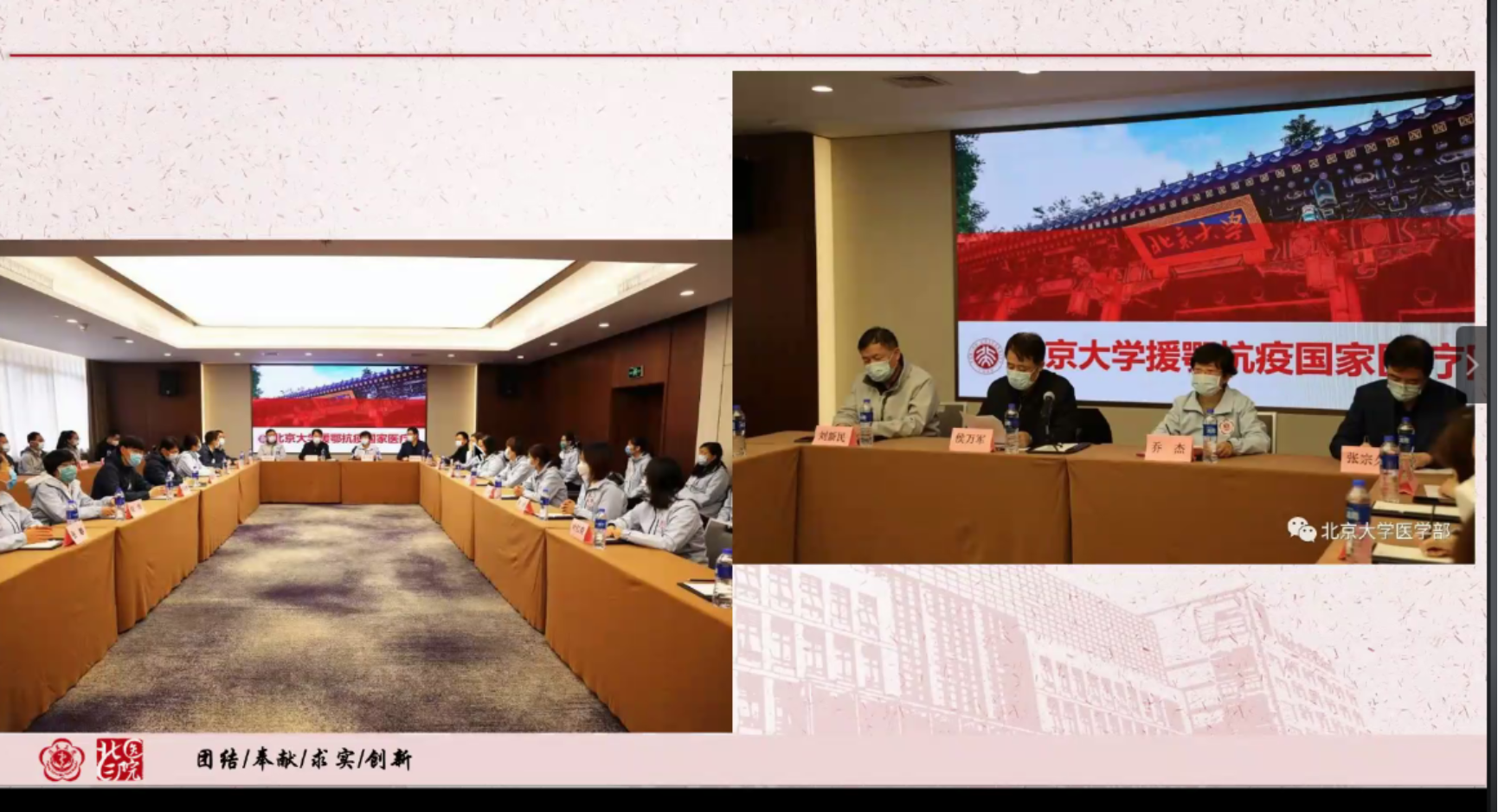 公开课上,庄昱老师首先和大家分享了他在支援武汉期间的经历。他是援鄂医疗队管理组的副组长,参与在武汉所有工作的后勤保障、活动安排。北京大学医疗队共派出了三批队员,从探索救治模式、创建危重症隔离病房样板,到复制成功经验与模式、扩展新病房,再到救治手段和组织形式不断成熟、独立整建制运行病房,这期间医院的院长领导、经验丰富的医生和年轻小队员在武汉并肩作战,克服了许多困难。