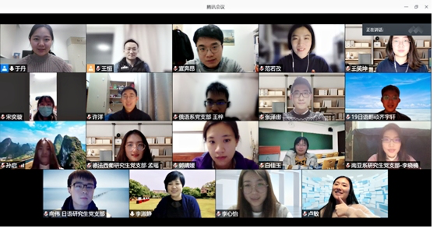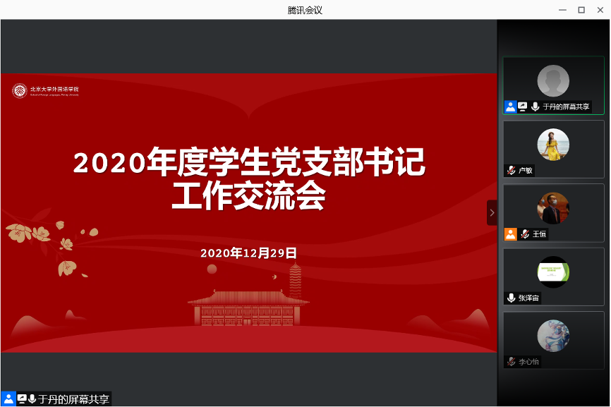 12月29日晚,外国语学院召开2020年度学生党支部书记工作交流会,为配合当前疫情防控工作,本次交流会采用腾讯会议线上开展,院党委书记李淑静、党委副书记王恒、团委书记卢敏出席活动。会议由团委副书记于丹主持,16名学生党支部书记参加会议。
