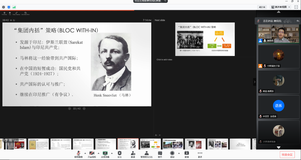 最后,谢老师沿历史脉络讲解了移民群体以及海外华人组织在东南亚马克思主义思想传播和抗日救亡运动中的积极推动作用,阐述了东南亚本地民族主义运动与“中国性”及“华人性”之间的矛盾,引人深思。