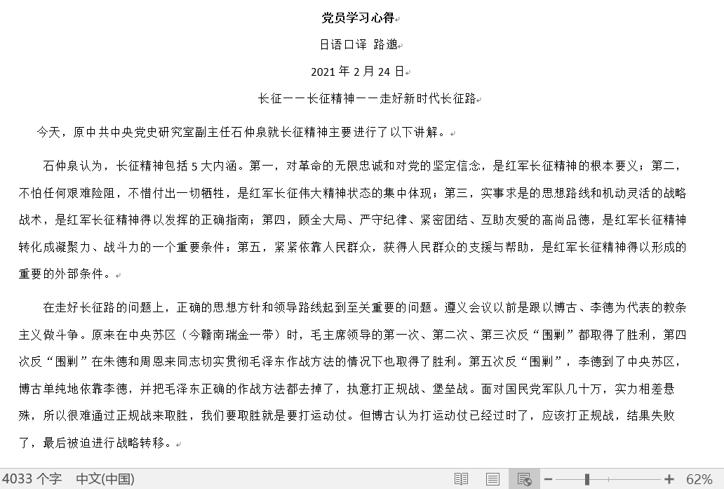 2月24日,外国语学院16个学生党支部共同开展线上学习“名师大家讲党史”活动,公开课第八讲主讲人石仲泉老师以《长征——长征精神——走好新时代长征路》为题,回顾长征历程、解读长征的基本概念和内涵,讲述长征精神在新时代的新内涵。学院全体学生党支部成员采用了单人学习、党小组共同学习等方式,对长征精神有了更深刻的理解,以下为各支部学习心得节选内容: