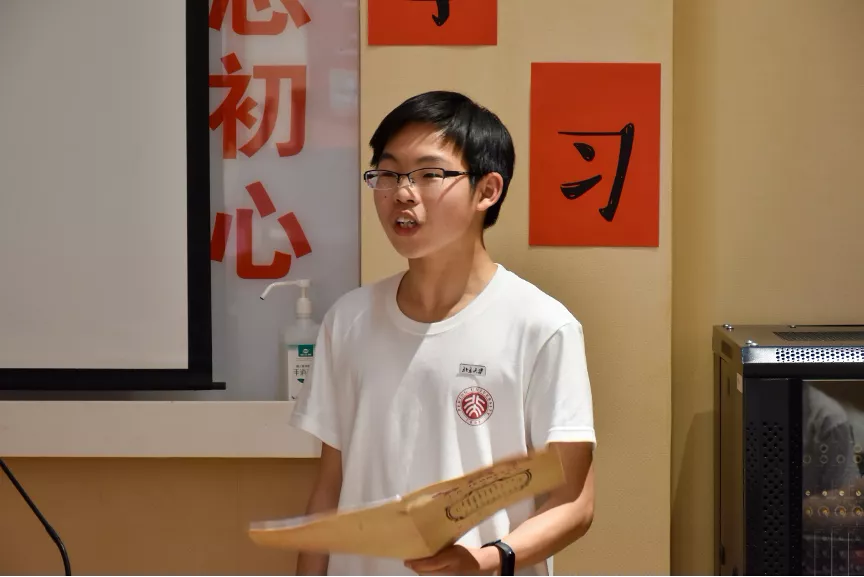 黄祝坚爷爷在同学们面前谈起自己的青春岁月时,神采飞扬,无比激动。在黄爷爷年轻的时候,国民党统治下的北平,物价飞涨、民不聊生。当时在读中学的他思想进步,经辅仁大学朋友介绍,加入了新民主主义青年团的地下组织,并在解放后光荣转至“地上”。在1952年,黄爷爷成为北大迁入燕园的第一批学生,也与北大结下了不解之缘,当年作为国庆游行北大队伍中的一员走过天安门,更是他最难忘的青春时刻。从北大毕业后,黄老在中科院动物所奉献一生,谈及七十年往事,他鼓励同学们对不断深入地认识党史国史,无论形势如何变化,踏实走好每一步。