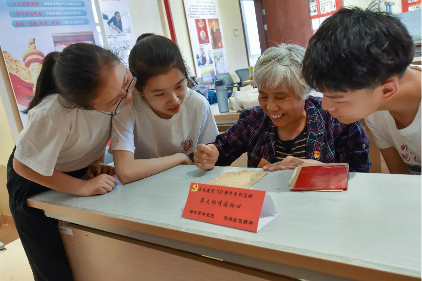 武开芳奶奶则带来了丰富的材料,甚至包括了她加入少先队的证书、小学时的日记和与朋友们交流的信件。武奶奶出生在解放战争的炮火中,伴随着共和国成长。武奶奶小学加入少先队后,成为了群众游行队伍的一员,那时便在天安门广场上见到了毛主席。即使自己身体不便,她也坚持从学校走到了天安门。高中毕业后她因为身体原因不能及时分配就业而一度消沉,但她接到了许多同学的来信鼓励,劝勉她无论在何处都可以为人民服务。在正式工作前,奶奶就在街道进行宣传工作。在正式到电子管厂工作后,她努力自学各种先进技术,考取了多个技术证。1982年她又考入人民大学,取得了优异的成绩。即使在退休后武奶奶也闲不下来,自学了书法。在晚年作为长辈和老党员,她把自己的故事讲述给年轻人,鼓励年轻人为祖国、为社会努力奋斗。