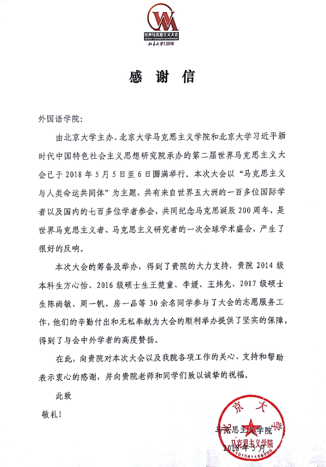 期间,外国语学院师生高度重视并支持此次盛会,积极投身语言翻译及志愿者招募工作,获得主办单位高度评价。据统计,2014级本科生方心怡、2016级硕士生王楚童、李媛、王炜先、2017级硕士生陈尚敏、周一帆、房一品等30余名同学参与了大会的志愿服务工作,他们的辛勤付出和无私奉献为大会的顺利举办提供了坚实的保障,得到了与会中外学者的高度赞扬。马克思主义学院特发来感谢信,对他们的支持和帮助表示衷心的感谢。