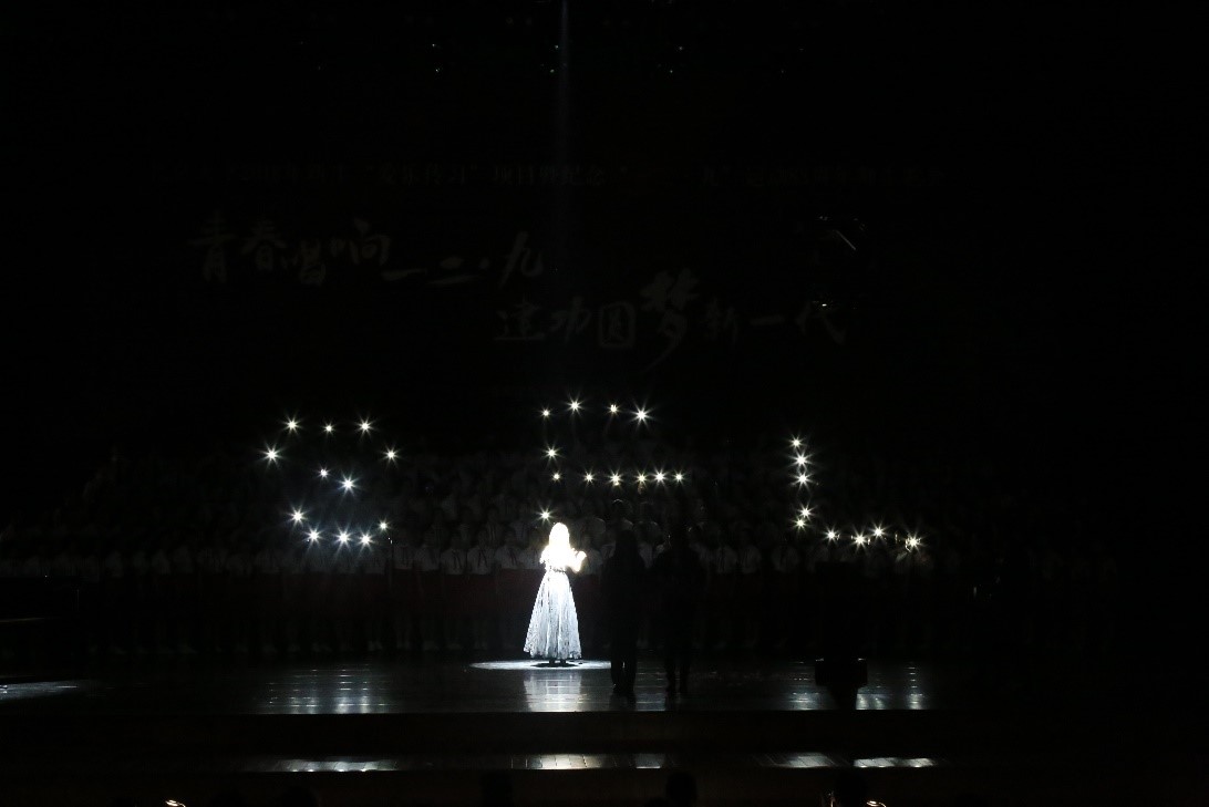 百年讲堂,大幕拉开,强队云集,座无虚席。十支学院代表队及离休教职工合唱团、校友爱乐合唱团、民主党派合唱团悉数登场,共同奉献了精彩纷呈的演出。外院代表队倾力呈现的《永远》,将整个“一二•九”师生歌会气氛推向高潮。大幕开启,指挥精准的手势和钢琴伴奏细腻的音符奏出一曲天籁;演唱之中,全体合唱团成员饱含深情、张力十足,和声处理张弛有度、拿捏细腻,呈现了一首超高水平的合唱曲目;舞台剧组生动地展现了从先驱们的筚路蓝缕到今日祖国繁荣华章中一代代前仆后继的外院人的使命与担当。落幕之时,“世界在我脚下,祖国在我心中”的响亮口号喊出了每个外院学子的心声。舞台上洋溢着的爱国之情、师生之谊、青春之华、艺术之美,征服了评委和观众。